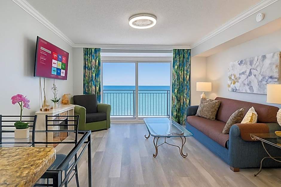This room features a microwave, refrigerator, and cable TV with a DVD player as well as a partial ocean view.